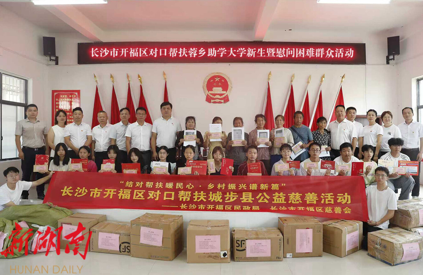 8月22日至24日,开福区驻城步对口帮扶工作组联合开福区民政局、开福区慈善会,携手湖南善孝堂养老服务有限公司、开福区开心果儿童发展中心、开福区臸诚社会工作服务中心、永州和正古康生物科技有限公司等多家爱心组织和企业,前往邵阳市城步苗族自治县开展“结对帮扶暖民心·乡村振兴谱新篇”活动。活动通过助学资助、物资捐赠和产业帮扶等多种形式,为当地困难群体送去温暖与关怀,并积极探索常态化结对帮扶协作机制。